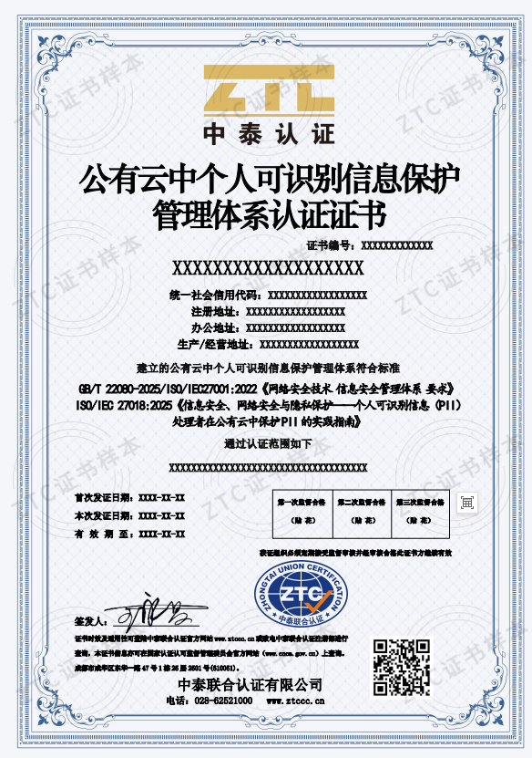 認證標準:GB/T 22080-2025/ISO/IEC27001:2022《網絡安全技術 信息安全管理體系 要求》、ISO/IEC 27018:2025《信息安全、網絡安全與隱私保護——個人可識別信息(PII)處理者在公有云中保護PII的實踐指南》